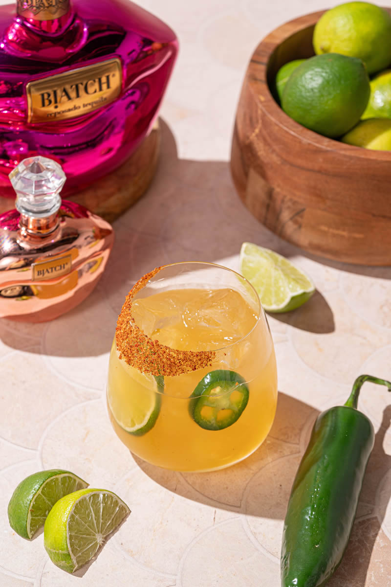 This spicy cocktail blends BIATCH Reposado with cucumber, habanero, Ancho Reyes Verde, lime, and agave for a fiery yet refreshing taste.