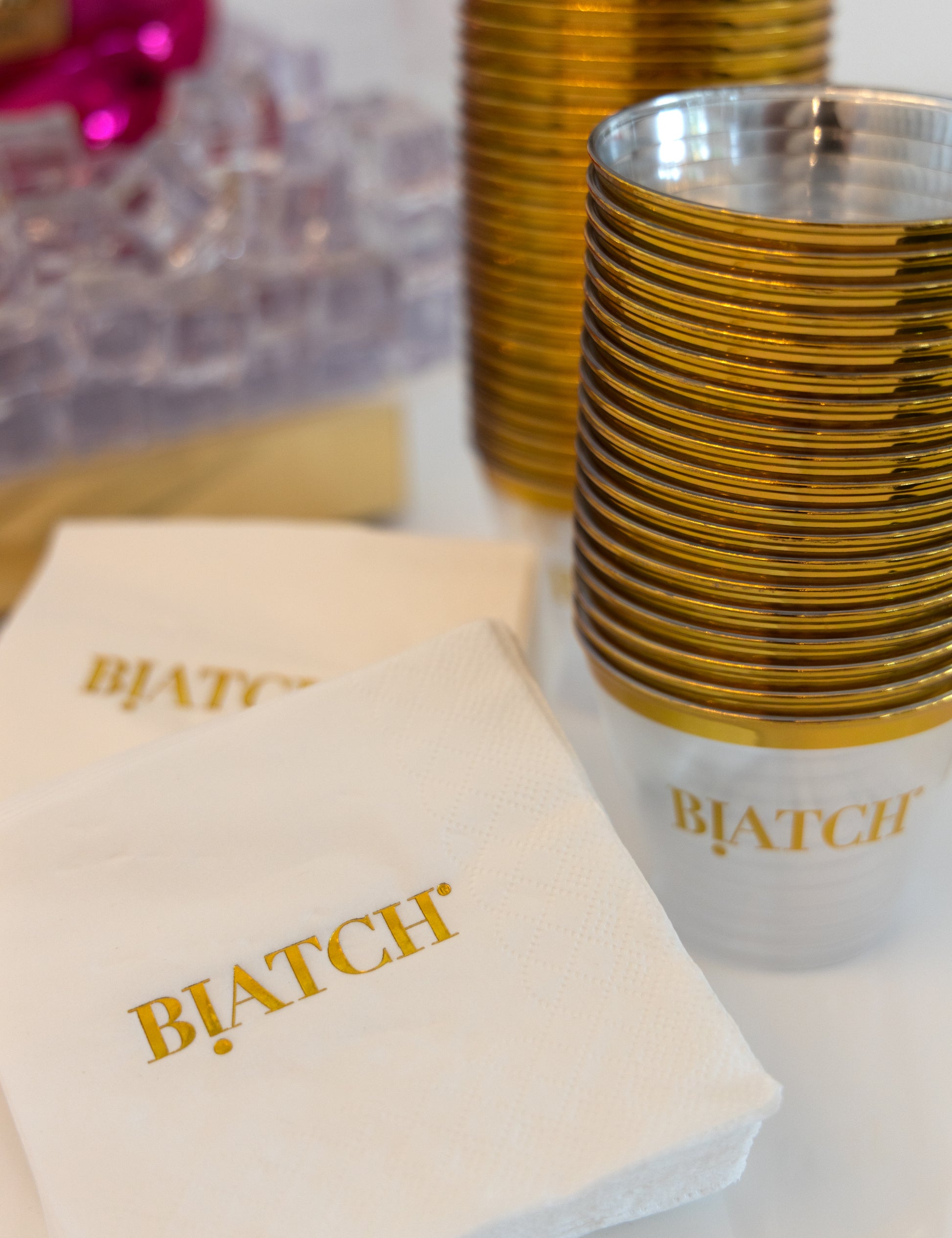 - 50-pack of gold-rim BIATCH® plastic party glasses