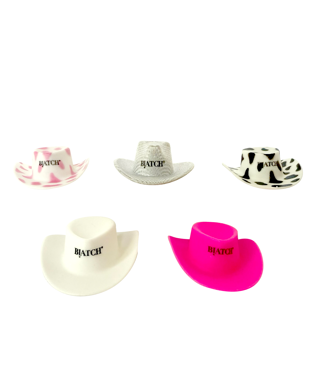 The BIATCH® Cowgirl Bundle is the ultimate combo of bold flavor and fierce fashion — featuring two 100mL bottles of LiL’ BIATCH® Tequila (Rosa or Reposado) and a 5-pack of our iconic mini cowgirl hats.